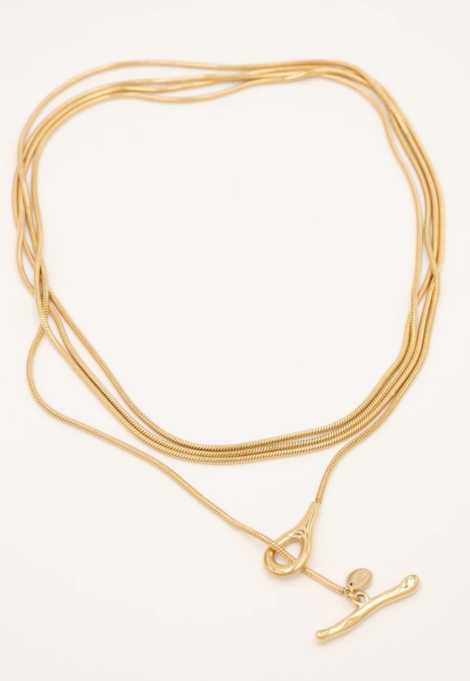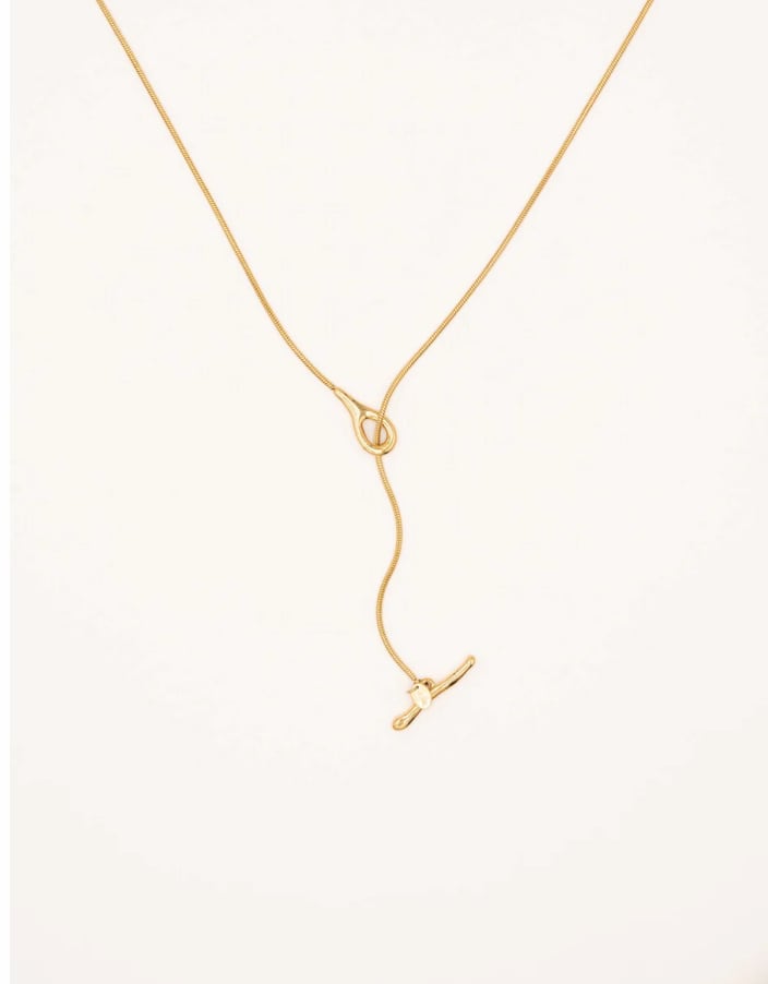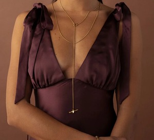 Y字型のネックレス、タイタイプとコーディネートできます。イングリッシュリンクとT字型の留め金で構成されたロングチェーン