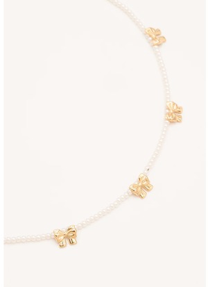 チョーカータイプのネックレスは、白い​​樹脂ビーズで装飾された細いチェーンと、蝶ネクタイの形をした小さなペンダントで構成されています。
